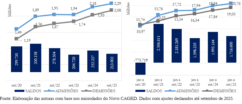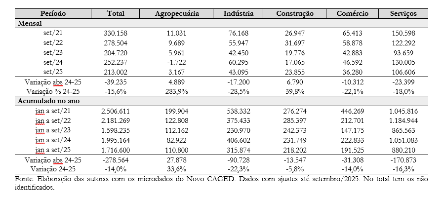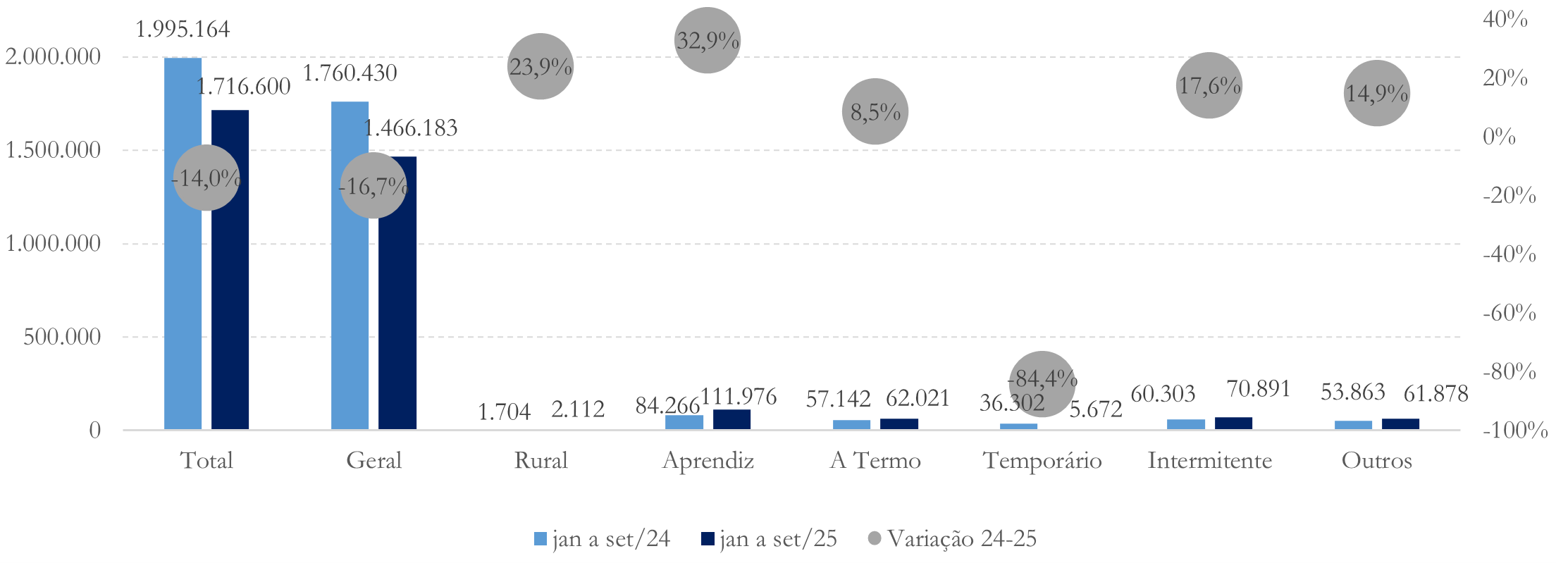 Em setembro de 2025, o saldo de empregos formais foi de 213.002 postos, uma retração de 15,6% em relação a setembro de 2024, enquanto o acumulado dos nove primeiros meses do ano atingiu 1.716.600, 14,0% abaixo do mesmo período do ano anterior. Apesar de todos os setores apresentarem saldo positivo no mês, apenas agropecuária e construção civil tiveram crescimento em relação a setembro de 2024; no acumulado, só a agropecuária avançou frente a 2024, enquanto a construção teve o pior resultado desde 2021. Entre os tipos de vínculo, destacaram-se os avanços do regime de aprendiz, intermitente e outros, ao contrário da categoria geral, que caiu 16,7%.