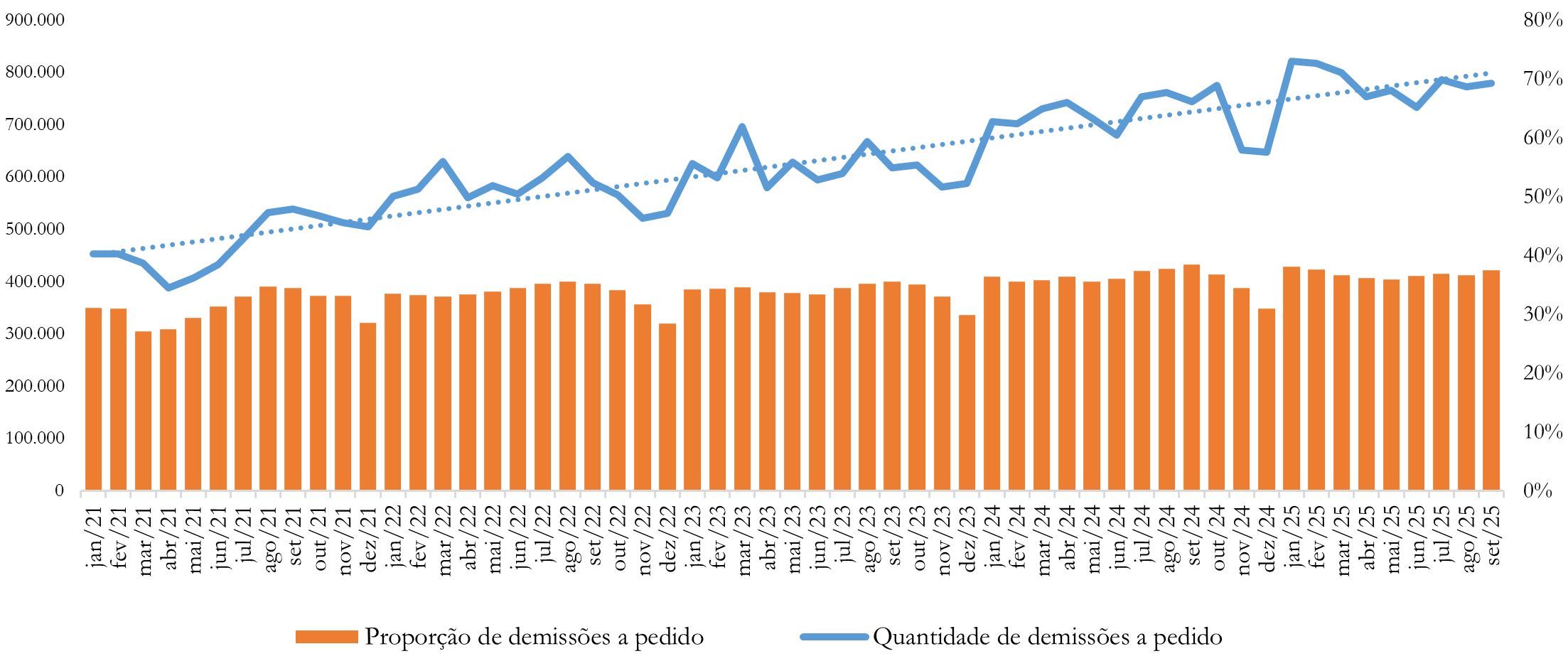 As demissões a pedido são um importante termômetro do aquecimento do mercado de trabalho, pois indicam maior confiança dos trabalhadores na possibilidade de encontrar novas oportunidades. O Gráfico 3 revela a evolução mensal dessa modalidade e sua participação no total de desligamentos entre janeiro de 2021 e setembro de 2025.