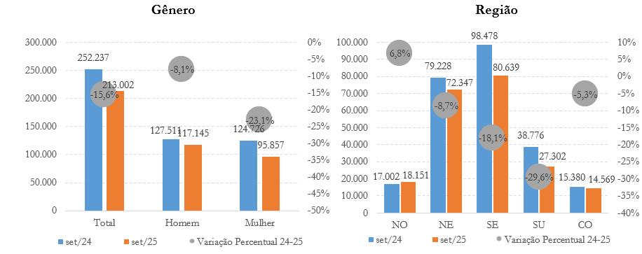 Em set/25 o saldo de empregos formais de 213.002 vagas recuou 15,6% em relação a setembro de 2024. Os grupos das mulheres, dos trabalhadores qualificados e das faixas etárias elevadas registraram as maiores quedas do saldo em relação a set/25.