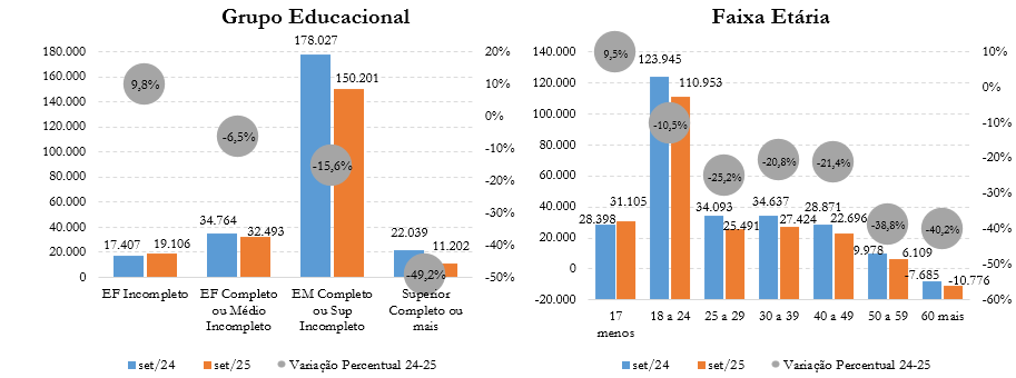 Em relação à faixa etária, apenas os jovens de até 17 anos tiveram aumento no saldo de empregos (9,5%). As demais faixas experimentaram retrações, com as quedas mais expressivas concentradas entre trabalhadores de 50 a 59 anos (-38,8%) e acima de 60 anos (-40,2%). Esses resultados evidenciam que, em setembro de 2025, a retração do mercado de trabalho afetou de maneira mais intensa as mulheres, as regiões Sul e Sudeste, trabalhadores com maior escolaridade e faixas etárias mais elevadas, ao passo que grupos mais jovens e com menor escolaridade apresentaram desempenho relativamente melhor.