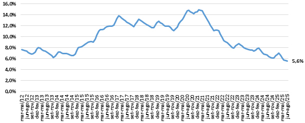 De acordo com a Figura 1, a trajetória da taxa de desemprego entre 2012 e 2025 registrou oscilações marcantes. Após relativa estabilidade até 2014, o índice passou a subir fortemente, alcançando picos históricos durante a crise econômica 2015-2016 e, sobretudo, durante a pandemia de Covid-19, quando atingiu quase 15% em meados de 2021. A partir desse ponto, iniciou-se um movimento de queda gradual, refletindo a recuperação do mercado de trabalho. No trimestre móvel encerrado em agosto de 2025, o desemprego atingiu 5,6%, o menor nível da série, sinalizando avanços na absorção de mão de obra e maior dinamismo econômico.
