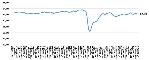 Mesmo tendo voltado a crescer desde o início de 2023, no trimestre móvel encerrado em agosto de 2025 a taxa de participação estava em torno de 62,3%, abaixo do patamar pré-pandemia (quarto trimestre de 2019), que era de 63,4%.