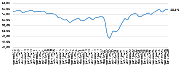 Com a pandemia, houve nova retração no nível de ocupação, levando o indicador ao seu menor patamar em meados de 2020. Superada a fase mais aguda da crise sanitária, este indicador retomou a trajetória de crescimento consistente, alcançando, no trimestre móvel encerrado em agosto de 2025 cerca de 58,8%.