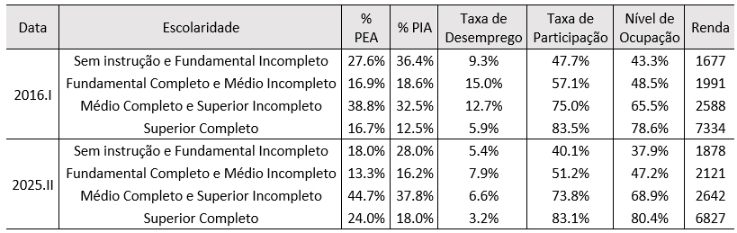 Verifica-se, ainda, uma relação monotônica entre a escolaridade e variáveis como taxa de participação, nível de ocupação e rendimento do trabalho: quanto maior o grau de instrução, mais elevados tendem a ser os valores dessas variáveis.