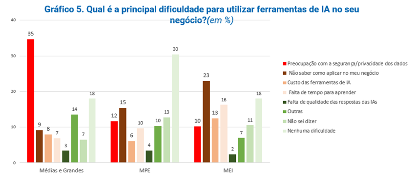 Com relação às dificuldades para usar IA no negócio, mais uma vez, é possível verificar diferentes padrões entre empresas de portes distintos. No caso das médias e grandes empresas, a “Preocupação com a segurança/privacidade dos dados” é majoritariamente a principal, com 35% das respostas, enquanto as outras sete dificuldades são citadas em menor percentual. Em parte, essa preocupação se justifica, pois são empresas que, muitas vezes, lidam com um número grande de clientes e/ou cujo vazamento de informações poderia causar muitos prejuízos ao negócio.