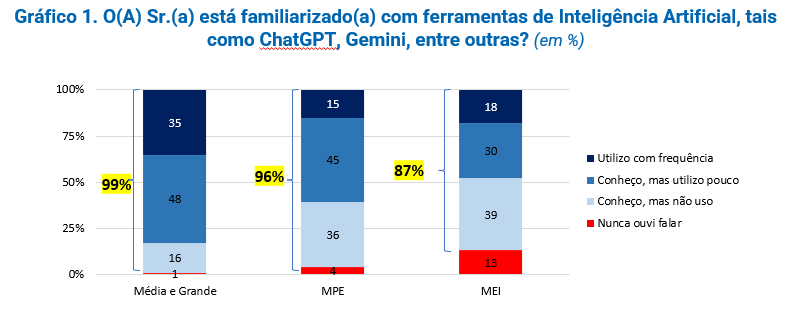 Cerca de 99% dos dirigentes de médias e grandes empresas afirmam já possuir algum tipo de familiaridade com ferramentas de IA generativa, tais como ChatGPT, Gemini, entre outras. Essa proporção cai para 96% nas MPE (Micro e Pequenas Empresas) e para 87% entre os MEI (Microempreendedores Individuais). A proporção também cai quando o quesito é mais rigoroso, “Utilizo com frequência”, que chega a 35% das médias e grandes empresas, 15% das MPE e 18% dos MEI (Gráfico 1).