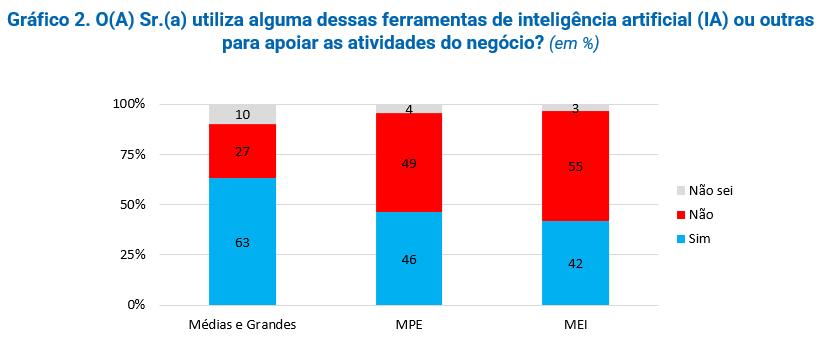 A aplicação direta destas ferramentas (ou outras) para apoiar as atividades do negócio também foi tema de pesquisa. No caso das médias e grandes empresas, chega a 63% o percentual de empresas que utiliza essas ferramentas nos negócios, caindo para 46% nas MPE e 42% nos MEI (Gráfico 2). Mais uma vez, o fator porte se mostra determinante para a intensidade de uso de IA generativa (e outras) no negócio. O resultado sugere uma situação de “copo meio cheio, copo meio vazio”: há um percentual relevante que já incorpora a IA em suas atividades, mas de forma geral, ainda há um espaço grande para o avanço dessas aplicações nos negócios brasileiros.