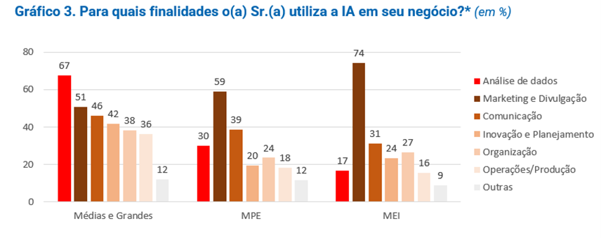 No que diz respeito às finalidades do uso de IA, verificou-se prioridades também diferentes entre empresas de distintos portes. No caso das médias e grandes empresas, 67% apontam o uso para “Análise de dados”, mostrando que neste porte há uma preocupação em tornar as empresas, de fato, “orientadas para dados” (Gráfico 3). E em segundo lugar, com 51%, o uso em “Marketing e divulgação”. No caso das empresas de menor porte, a ênfase é muito maior em “Marketing e divulgação”, com 59% nas MPE e 74% entre os MEI, seguido por “Comunicação”, e com o uso para “Análise de dados” caindo para a 3ª colocação (com 30% das MPE e 17% nos MEI). Em parte, isto pode estar associado ao fato de que, nos Pequenos Negócios, em geral, são maiores as dificuldades na captação e manutenção de clientes (característica típica de PN), o que pode estar levando estas empresas a explorarem mais o uso de IA nas esferas onde são maiores as suas dificuldades.