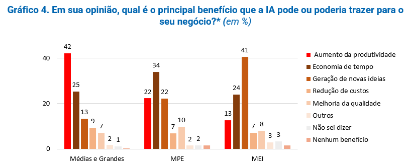 Mais uma vez, é possível perceber diferenças por portes de empresas. Entre os benefícios, o “Aumento de produtividade” é destacadamente o mais importante entre as médias e grandes empresas, com 42%, seguido pela “Economia de tempo” (25%). E isto parece estar associado ao fato de que, entre as empresas deste porte, ser este item um dos principais para determinar a competitividade do negócio. No caso das MPE, o maior benefício é a “Economia de tempo”, com 34%, seguido pelo empate entre “Aumento de produtividade” e “Geração de novas ideias”, ambos com 22%. Para os MEI, a “Geração de novas ideias” lidera o ranking dos benefícios com 41%, seguido pela “Economia de tempo” (24%) e “Aumento de produtividade” (13%). O nível quase “nanico” destes negócios, parece levá-los a buscar a IA para o desenvolvimento de suas maiores vantagens competitivas (flexibilidade e adaptação).