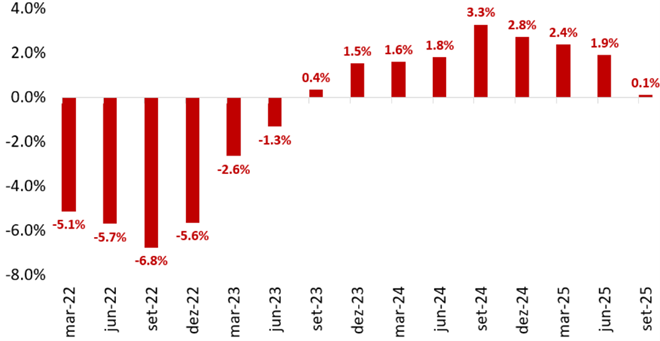 As pressões salariais, que se avolumaram em 2024, deram sinais mais positivos no decorrer de 2025. O longo processo de recuo da taxa de desemprego teve impactos relevantes nos indicadores salariais europeus. Após um pico de crescimento real ao final de 2024, com taxas de expansão da remuneração inconsistentes com a produtividade dos trabalhadores europeus, iniciou-se um processo de descompressão do crescimento dos salários, passando a uma virtual estabilidade interanual no último dado disponível (gráfico 3). Se por um lado o forte crescimento dos salários deu vigor à demanda interna e ao crescimento, por outro lado representou um desafio à convergência da inflação europeia – o que é particularmente importante para a inflação de serviços.