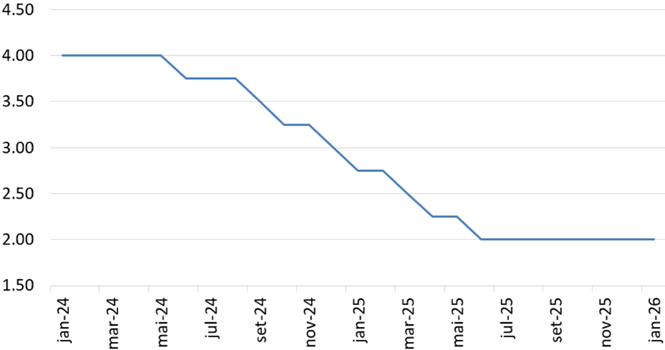 No cenário central, esperamos que os juros europeus fiquem estáveis até o final do ano. Reconhecido o sucesso na condução da política monetária e com estimativas de que o juro referencial europeu está em torno da neutralidade, não faz sentido esperar, no cenário central, que o ECB modifique as taxas de juros durante 2026. Evidentemente, inúmeros choques e ruídos podem ocorrer, levando à necessidade de recalibrar o cenário. No entanto, com a informação disponível no início de 2026 e reconhecendo a estrutura de riscos prospectivos, a autoridade monetária europeia pode se dar ao luxo de “esperar para ver”.