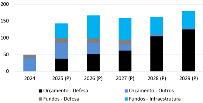 2025 foi um ano de mudanças estruturais relevantes, especialmente em matéria fiscal. No final de março, o Parlamento alemão (Bundestag) aprovou um plano trilionário de investimentos em defesa e infraestrutura, modificando a Constituição alemã para autorizar gastos, nesses segmentos, por fora das regras fiscais estabelecidas. No caso dos gastos com defesa, quaisquer aportes superiores a 1% do PIB alemão foram liberados dos limites impostos pelo teto de endividamento público. No caso dos investimentos em infraestrutura, foi criado um fundo extraorçamentário de €500bi, com desembolsos em até 12 anos e canalização de 20% dos haveres para transição climática e energética. Em paralelo, os governos subnacionais receberam €100bi para seus projetos e foi autorizado um aumento do seu limite de endividamento em até 0,35% do PIB, o equivalente a €16bi para cada estado. O aumento do endividamento começou em 2025 e deverá acelerar, de forma relevante, até o fim da década (gráfico 6); são novos tempos de política fiscal na Alemanha e na Europa.