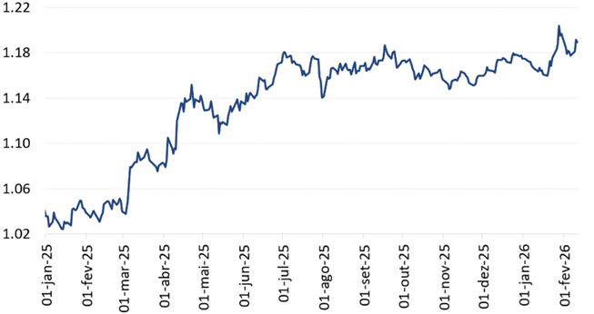 O comportamento do Euro deve ser acompanhado com atenção, em meio a mudanças estruturais. Em ambiente de demanda interna robusta, gestão macroeconômica eficiente (surpresas positivas no crescimento, convergência da inflação e redução dos juros), impulso fiscal crescente e demanda por ativos não-denominados no dólar americano, alinharam-se as condições para o fortalecimento do Euro. O movimento transcorreu durante todo 2025 (gráfico 7), com aceleração marcante quando da aprovação do pacote fiscal alemão (fim do 1º trimestre) e certa estabilização a partir de meados do ano. Note-se que a moeda europeia voltou a se fortalecer no início de 2026, mantendo o tema “quente” para o futuro próximo.